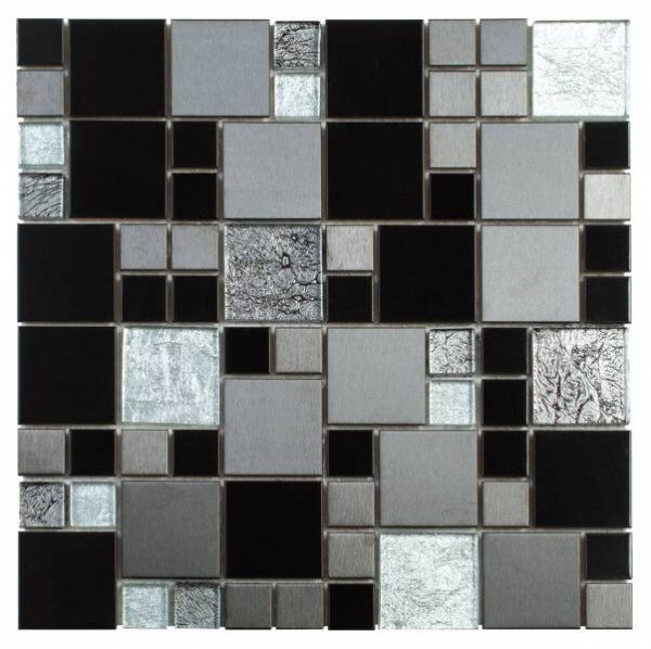 Bati Orient Tile - Glass Tile Brushed Steel Mix Cube 12" x 12" - Black and Grey